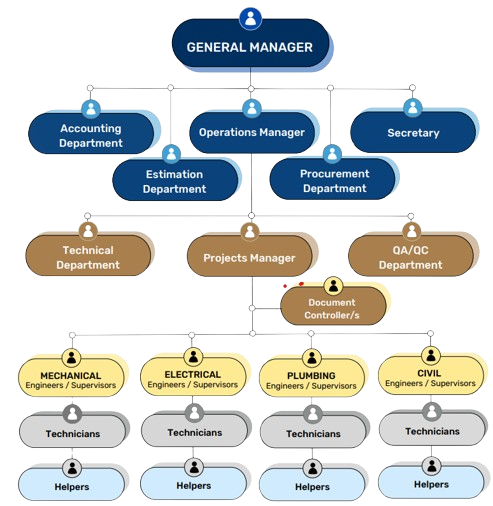 In a contracting company that specializes in mechanical works (e.g., HVAC systems, plumbing, fire protection, piping, or industrial machinery), the mechanical team which includes a Mechanical Engineer, Mechanical Draftmen, Mechanical Supervisors, Mechanical Technician, Mechanical Helpers plays a critical role in the execution and management of projects.
